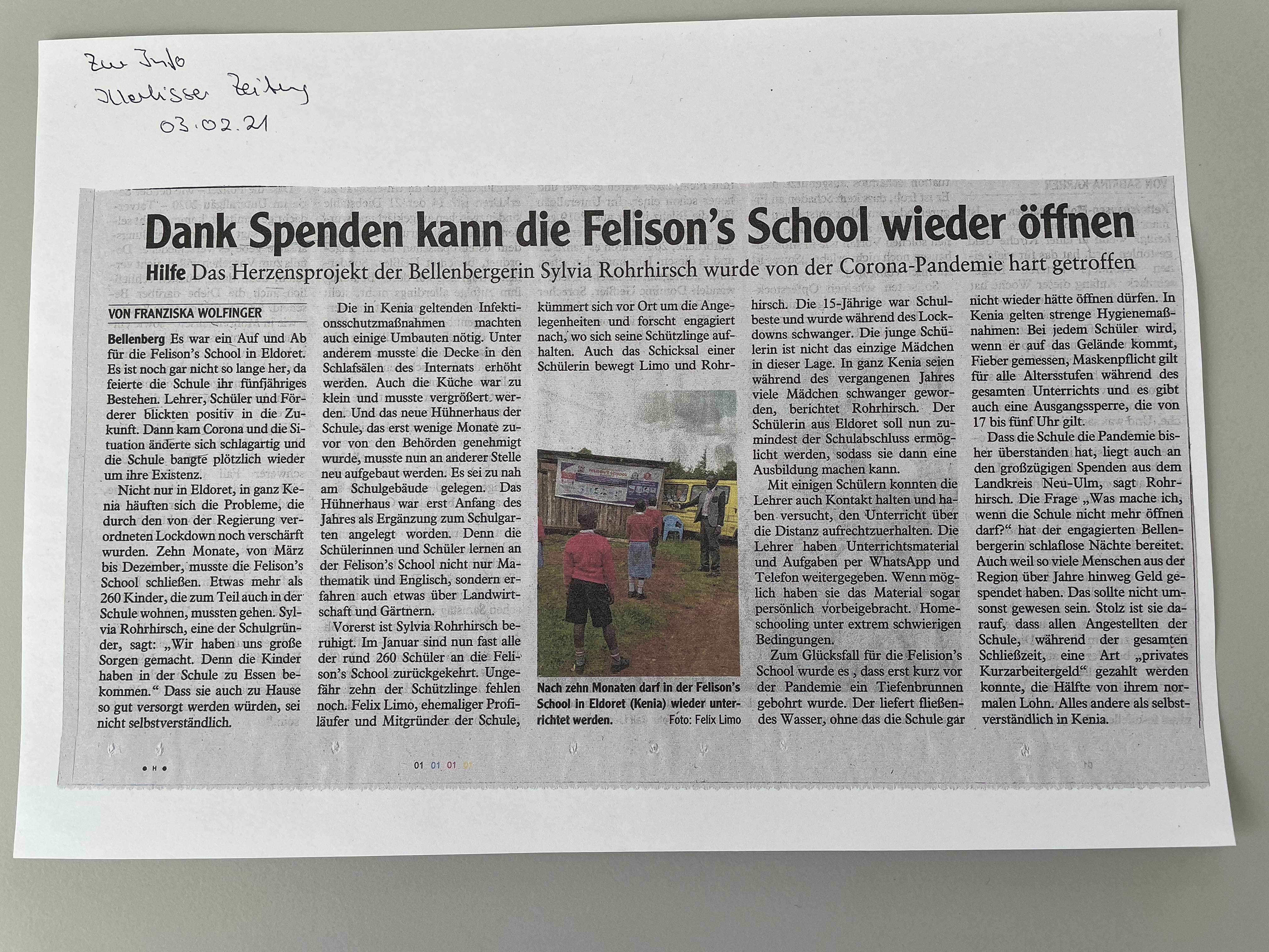 Wie jedes Jahr haben auch 2022 die Schülerinnen und Schüler der Uli-Wieland-Grundschule eine großzügige Spende in Höhe von 1371 Euro für die Felison´s School in Eldoret getätigt. Das Geld wird 10 Schülern (Vollwaisen / Herkunft aus schwerem sozialen Umfeld) zugute kommen, die nun kostenlos das Internat der Schule besuchen können. Illertisser Zeitung 25.10.2022
