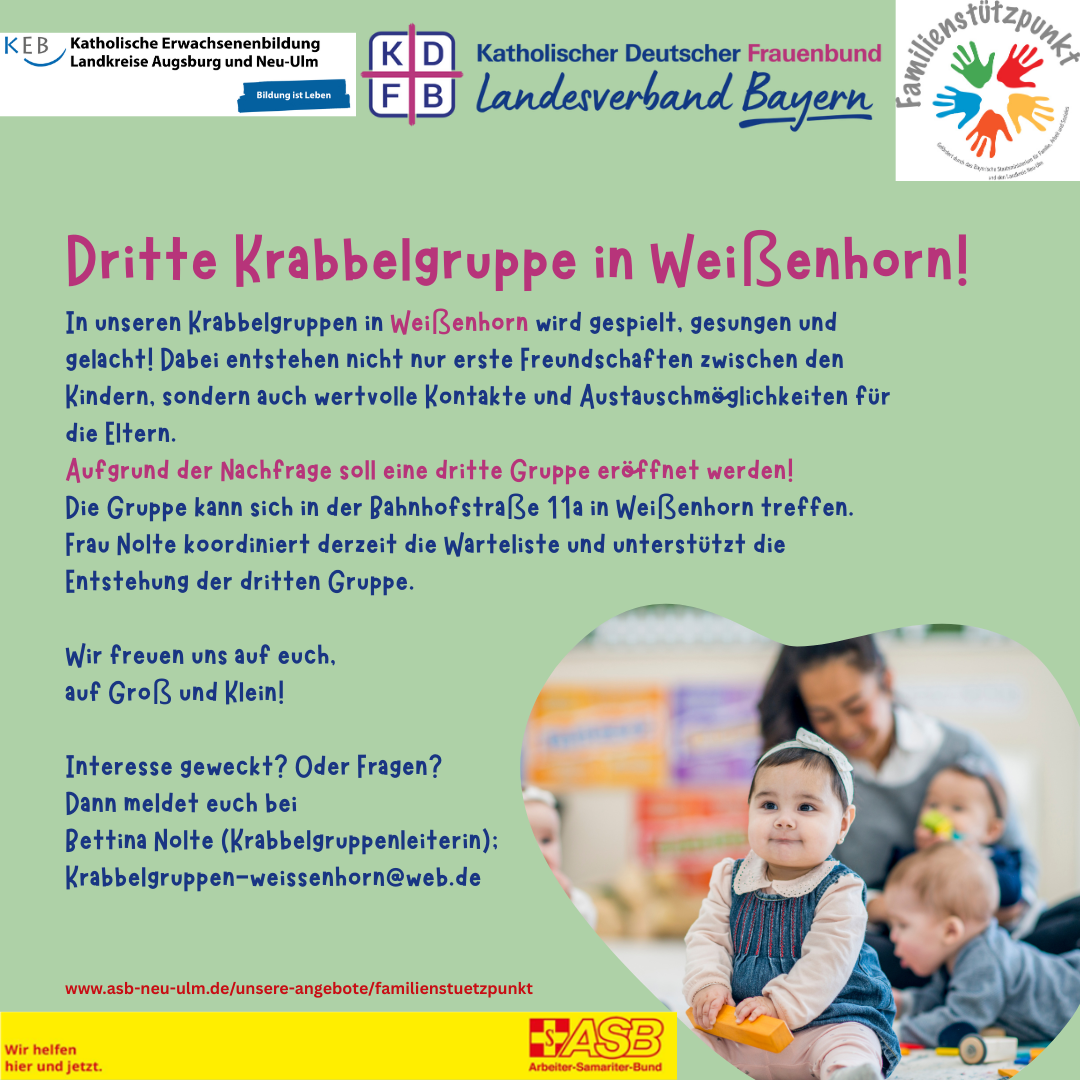 Die Eltern-Kind-Gruppen sind ein Kooperationsprojekt mit der „Katholischen Erwachsenenbildung für den Landkreis Neu-Ulm KEB“,  des „Katholischen Frauenbundes Landesverband Bayern“ und des Familienstützpunkts!